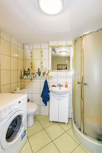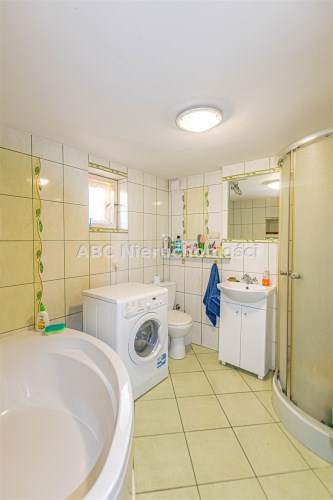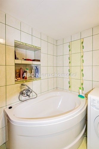 Wyposażenie łazienki kabina prysznicowa, lustro, pralka, umywalka, wanna, WC