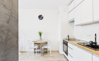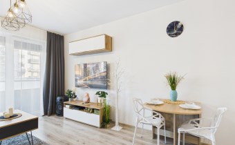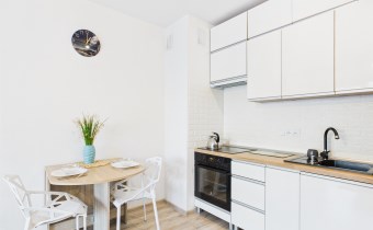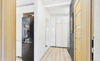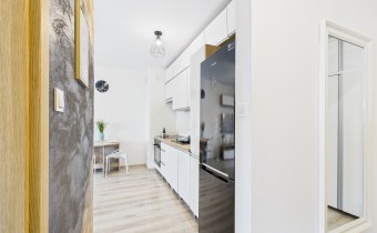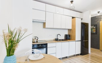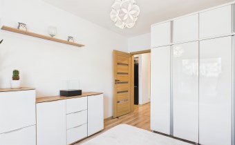 Z przestronnego salonu prowadzi wyjście na balkon o szerokości całego salonu, stanowiący idealne miejsce do wypoczynku. Kuchnia została wykonana w nowoczesnej zabudowie i wyposażona w nowoczesny sprzęt AGD, zapewniający komfort codziennego użytkowania. Mieszkanie oferuje liczne, pojemne szafy, które gwarantują dużą ilość miejsca do przechowywania.