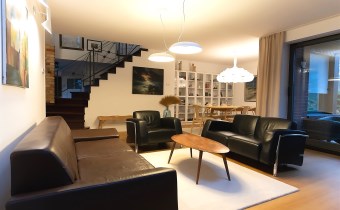 Na parterze o przemyślanym, funkcjonalnym układzie od wejścia wita przestronny salon z kominkiem, ciepły, przytulny i pełen charakteru. Salon z częścią jadalnianą. Salon stanowi serce domu – przestrzeń spotkań i odpoczynku. Z salony wyjścia na jeden z tarasów - idealne miejsce do spędzania wolnego czasu przy porannej kawie lub spotkań z bliskimi przy wspólnym posiłku