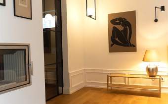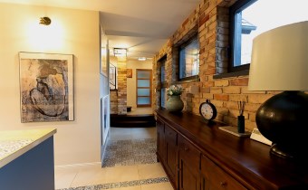Do kolejnej części domu prowadzą nas z kuchni z jadalnią stylowe drewniane drzwi z dużym przeszkleniem za którymi znajdują się: