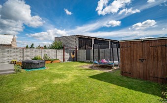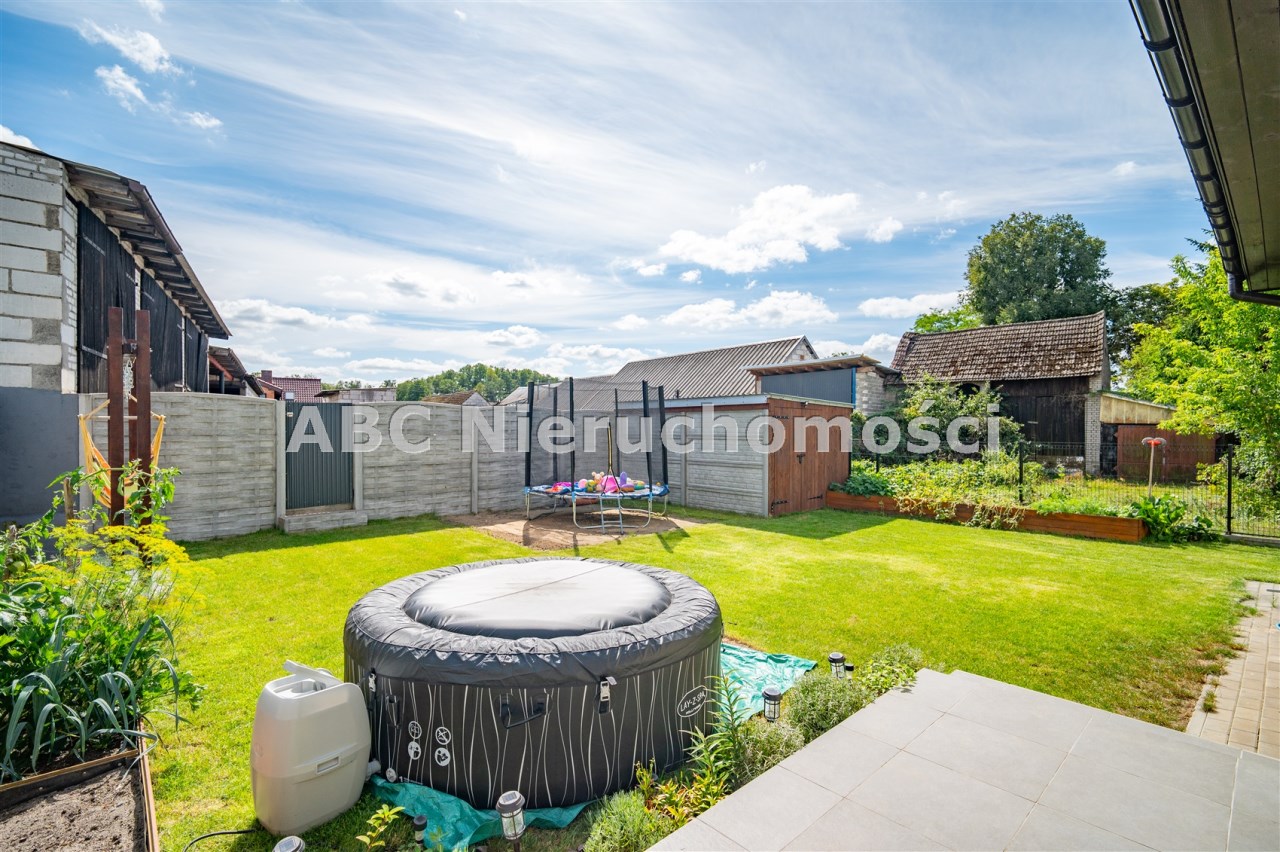 Działka o pow. 400m2, w kształcie zbliżonym do prostokąta. Działka zagospodarowana, zadbany trawnik, ozdobna zieleń, od frontu utwardzona kostką brukową.