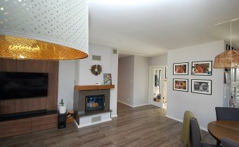 Salon podłoga w panelach,ściany gipsowane-malowane,wyposażony w kominek z płaszczem wodnym,świetnie doświetlony oknem balkonowym oraz tarasowym