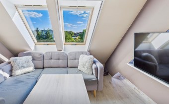 dwustronny układ – salon z aneksem kuchennym wychodzi na stronę zielonych ogródków,