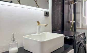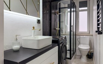Wyposażenie łazienki kabina prysznicowa, lustro, pralka, umywalka, WC