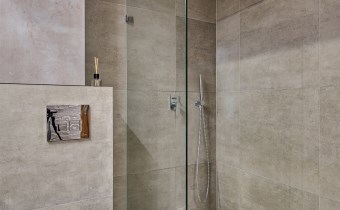 Łazienka została wykończona w surowym, nowoczesnym stylu inspirowanym betonem architektonicznym. Znajdziesz tu prysznic typu walk-in z odpływem liniowym oraz WC na stelażu typu Geberit. Minimalizm, estetyka i funkcjonalność w jednym.
