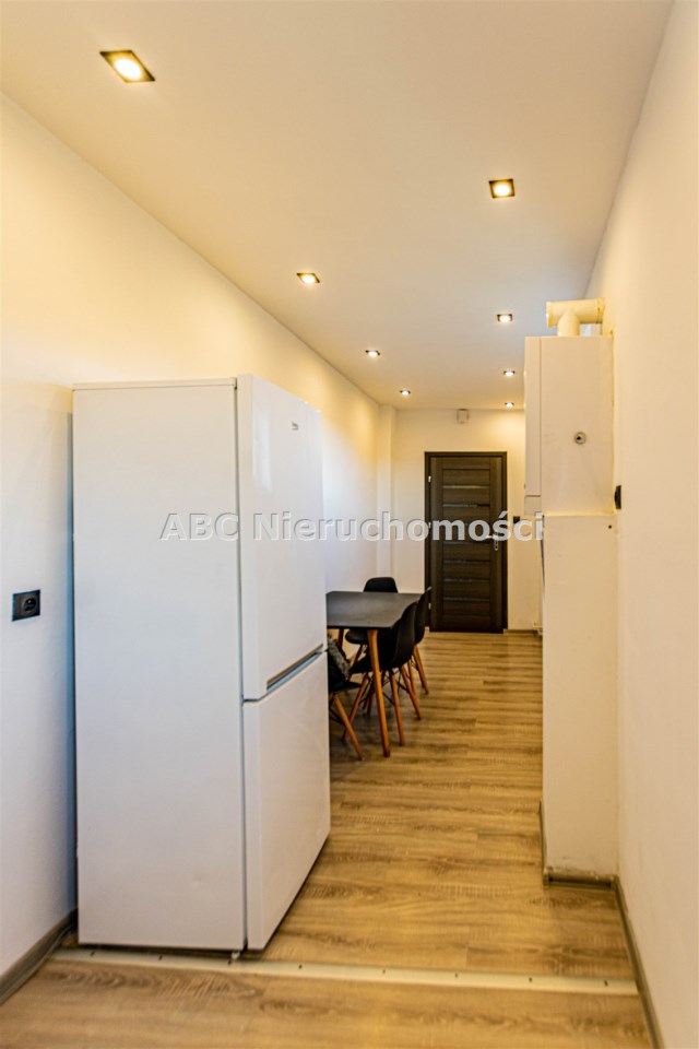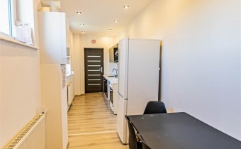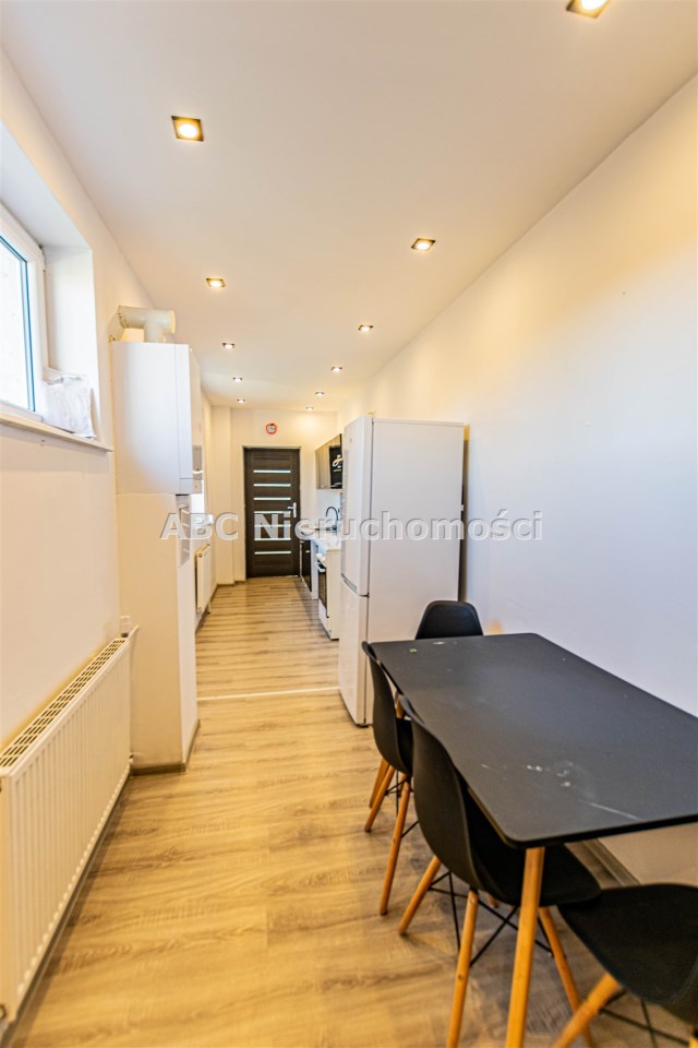W kuchni meble kuchenne wraz ze sprzętem AGD (kuchenka gazowa, lodówko - zamrażarka, okap, stół + krzesła).