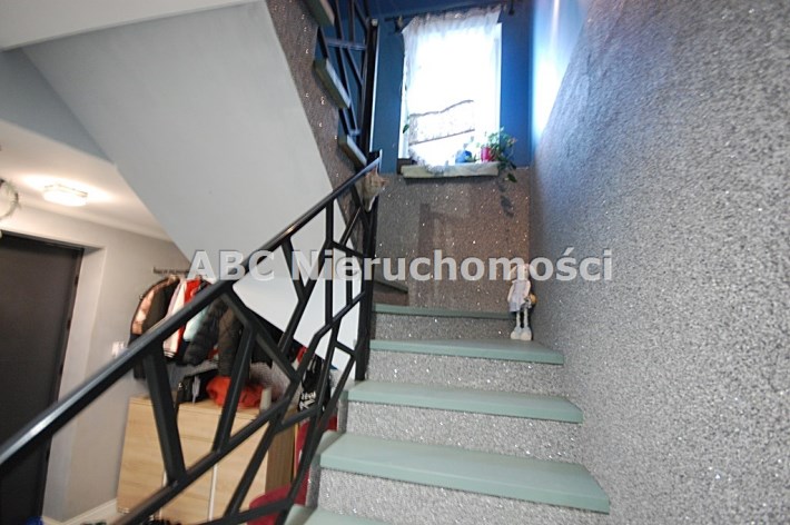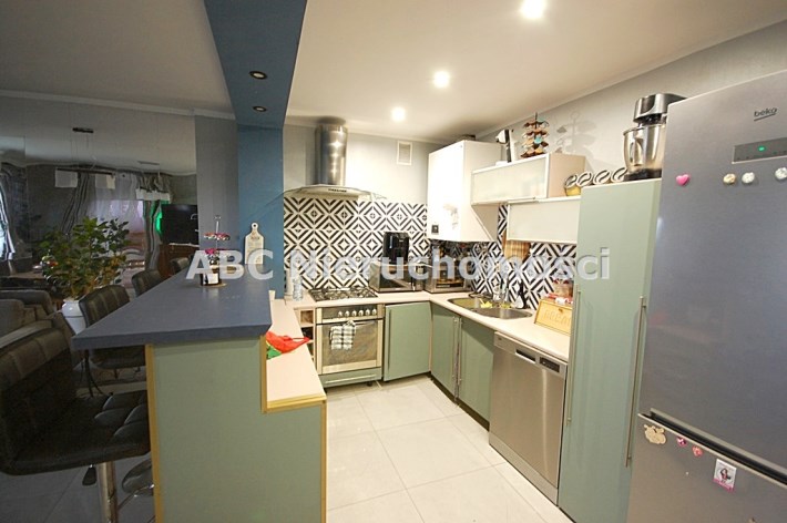 podłoga w gresie, ściany gipsowane-malowane, w części salonu ściana-lustro całość, piaskowiec, w części kuchennej fartuch glazury, schody lane-obłożone drewnem, ściana-tynk ozdobny, ogrzewanie podłogowe. W cenie zabudowa meblowa kuchni+AGD kuchenka z piekarnikiem elektrycznym+pochłaniacz, zmywarka, piec gazowy dwufunkcyjny-TERMET.