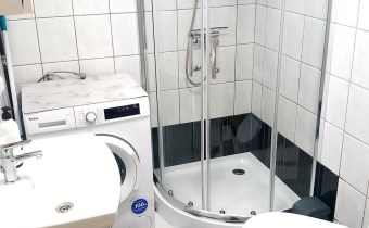 Łazienka - pralka, toaleta, kabina prysznicowa, szafka