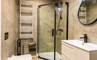 Wyposażenie łazienki kabina prysznicowa, lustro, pralka, umywalka, WC